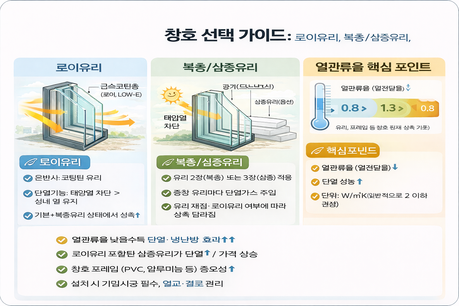 창호 선택 가이드: 로이유리, 복층/삼중유리, 열관류율 핵심 포인트(로이유리, 삼중유리, 열관류율)